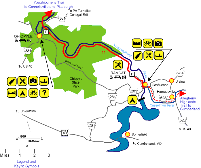 | This page is part of the Allegheny Trail Alliance's site in support of the Pittsburgh to Cumberland Trail, a motor-free recreational rail trail connecting Pittsburgh PA and Cumberland MD. Copyright © 1998, 1999, 2000 by Allegheny Trail Alliance, Bill Metzger, Mary Shaw, and Roy Weil. Amenity information courtesy of FreeWheeling Easy. We encourage you to create links to this site and to print copies of the maps for your personal use. We prohibit other uses of this site, especially if they generate spam or other mass communications -- see our Privacy Policy.. This page was last modified on 09/03/00. Send email to ATA or contact the ATA or member trails. | ||||||