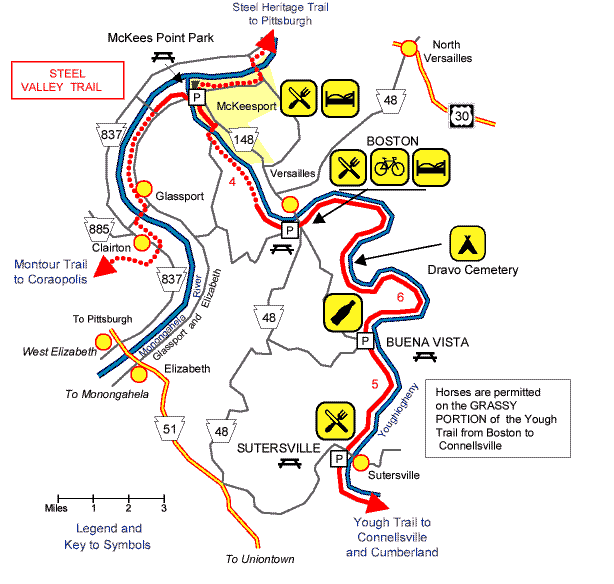 | This page is part of the Allegheny Trail Alliance's site in support of the Pittsburgh to Cumberland Trail, a motor-free recreational rail trail connecting Pittsburgh PA and Cumberland MD. Copyright © 1998, 1999, 2000 by Allegheny Trail Alliance, Bill Metzger, Mary Shaw, and Roy Weil. Amenity information courtesy of FreeWheeling Easy. We encourage you to create links to this site and to print copies of the maps for your personal use. We prohibit other uses of this site, especially if they generate spam or other mass communications -- see our Privacy Policy.. This page was last modified on 09/03/00. Send email to ATA or contact the ATA or member trails. | ||||||