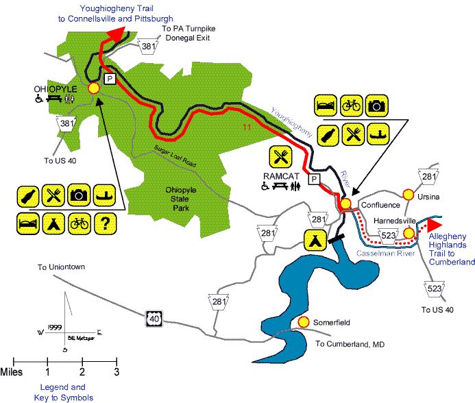 This page is part of the Allegheny Trail Alliance's site in support of the Great Allegheny Passage, a motor-free recreational rail trail connecting Pittsburgh PA and Cumberland MD. Copyright © 1998, 1999, 2000, 2001by Allegheny Trail Alliance, Bill Metzger, Mary Shaw, and Roy Weil. Amenity information courtesy of FreeWheeling Easy. We encourage you to create links to this site and to print copies of the maps for your personal use. We prohibit other uses of this site, especially if they generate spam or other mass communications -- see our Privacy Policy.. This page was last modified on 09/23/01. Send email to ATA or contact the ATA or member trails.