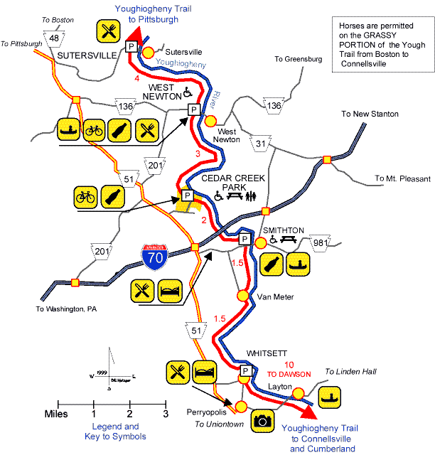 This page is part of the Allegheny Trail Alliance's site in support of the Great Allegheny Passage, a motor-free recreational rail trail connecting Pittsburgh PA and Cumberland MD. Copyright © 1998, 1999, 2000, 2001by Allegheny Trail Alliance, Bill Metzger, Mary Shaw, and Roy Weil. Amenity information courtesy of FreeWheeling Easy. We encourage you to create links to this site and to print copies of the maps for your personal use. We prohibit other uses of this site, especially if they generate spam or other mass communications -- see our Privacy Policy.. This page was last modified on 07/09/01. Send email to ATA or contact the ATA or member trails.