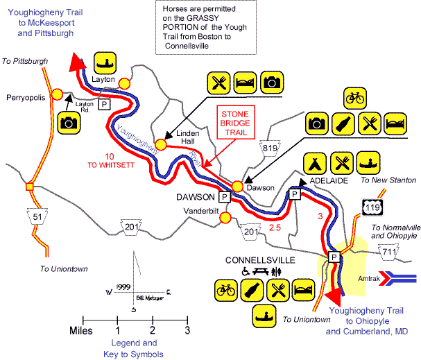 This page is part of the Allegheny Trail Alliance's site in support of the Great Allegheny Passage, a motor-free recreational rail trail connecting Pittsburgh PA and Cumberland MD. Copyright © 1998, 1999, 2000, 2001by Allegheny Trail Alliance, Bill Metzger, Mary Shaw, and Roy Weil. Amenity information courtesy of FreeWheeling Easy. We encourage you to create links to this site and to print copies of the maps for your personal use. We prohibit other uses of this site, especially if they generate spam or other mass communications -- see our Privacy Policy.. This page was last modified on 07/09/01. Send email to ATA or contact the ATA or member trails.