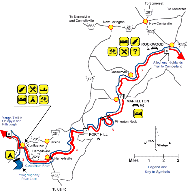 | This page is part of the Allegheny Trail Alliance's site in support of the Great Allegheny Passage, a motor-free recreational rail trail connecting Pittsburgh PA and Cumberland MD. Copyright © 1998, 1999, 2000, 2001by Allegheny Trail Alliance, Bill Metzger, Mary Shaw, and Roy Weil. Amenity information courtesy of FreeWheeling Easy. We encourage you to create links to this site and to print copies of the maps for your personal use. We prohibit other uses of this site, especially if they generate spam or other mass communications -- see our Privacy Policy.. This page was last modified on 09/23/01. Send email to ATA or contact the ATA or member trails. | ||||||